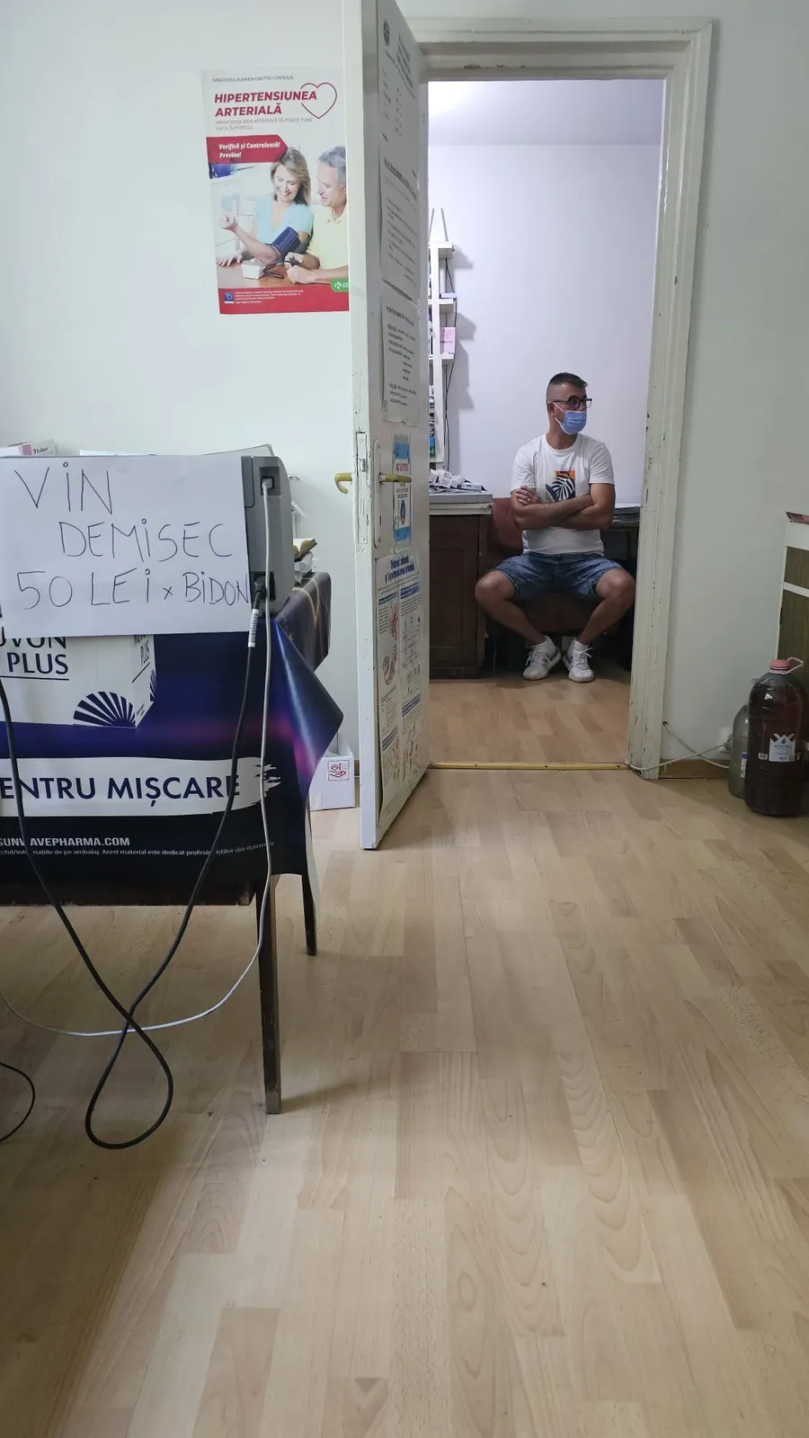 În cabinetul unui medic de familie din Târgoviște, Marius Atanasiu, poți merge ca în piață! Ai șansa să cumperi vin roșu demisec la bidon de 5 litri. Pacienții medicului văd de fiecare dată când merg la cabinetul cu pricina cam același anunț, doar culoarea bahică se mai schimbă din roșu în alb uneori, depinde cum merge producția. Consultațiile se țin ca în vremea pandmiei, cu masca anti-Covid pe față, iar ușa cabinetului la consultații se mai închide uneori, depinde de greutatea… pacientului. Medicul are și un ajutor care se ocupă de emiterea de rețete pentru pacienți și de ce mai este nevoie.