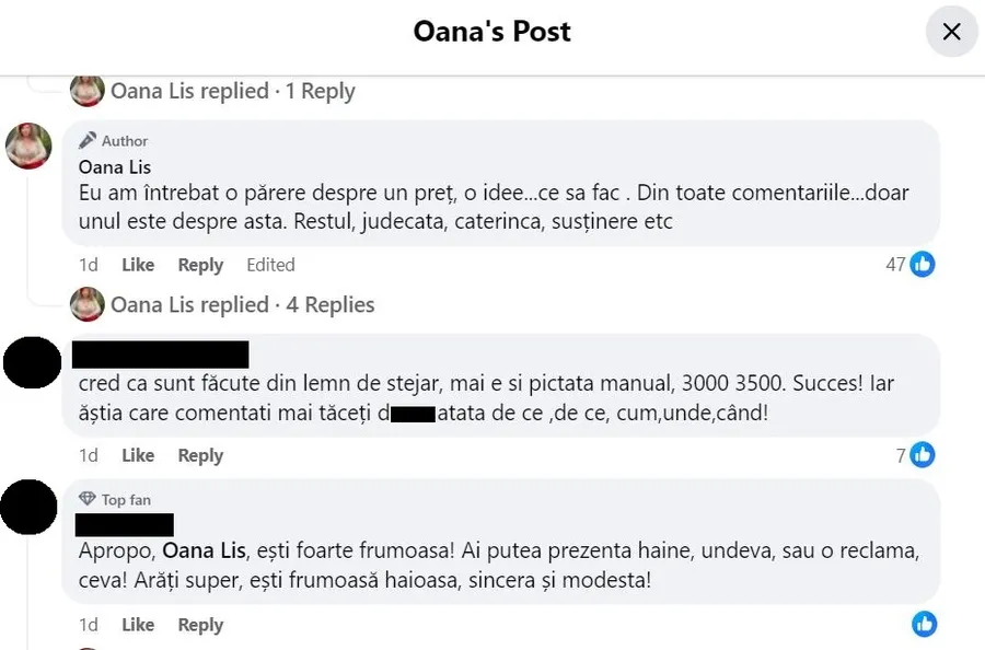 Ce recomandare de preț a primit Oana Lis, în secțiunea de comentarii / sursă foto: Facebook