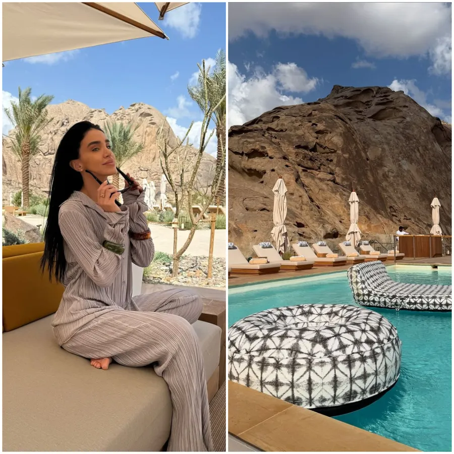 Resortul în care a ales să se cazeze nu este unul obișnuit. Construit direct în stânci, hotelul oferă o experiență de lux, în armonie cu peisajul spectaculos al deșertului. De la intrare, oaspeții sunt întâmpinați cu un prosop parfumat și un ceai tradițional, iar atenția la detalii este vizibilă la tot pasul.