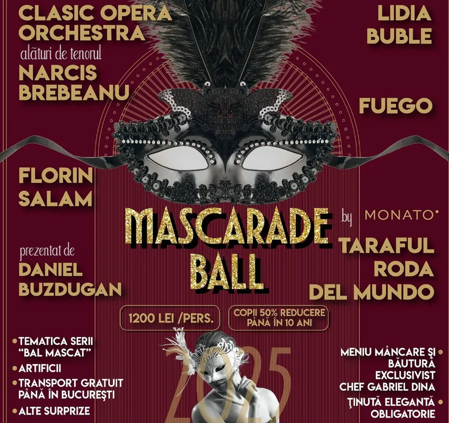 Tematica acestui an este ‘Bal Mascat’, o noapte plină de mister și contraste, dar așa cum știm cu toții ‘contrastele se atrag’, așa că vom lăsa măștile jos și ne vom distra până dimineața. Meniul, care va completa această seară specială va fi unul rafinat și exclusivist, conceput și realizat by Chef Gabriel Dina, în armonie cu eleganța și prestigiul acestui eveniment.”, se arată pe pagina restaurantului.