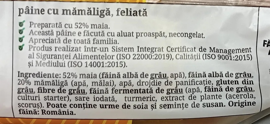 Înainte de a cumpărat orice fel de produs din magazine, românii trebuie să fie atenți ce scrie pe etichetă. În cazul acesta, conform valorilor din declarația nutrițională de pe eticheta produsului, pâinea cu mămăligă este preparată din următoarele ingrediente: