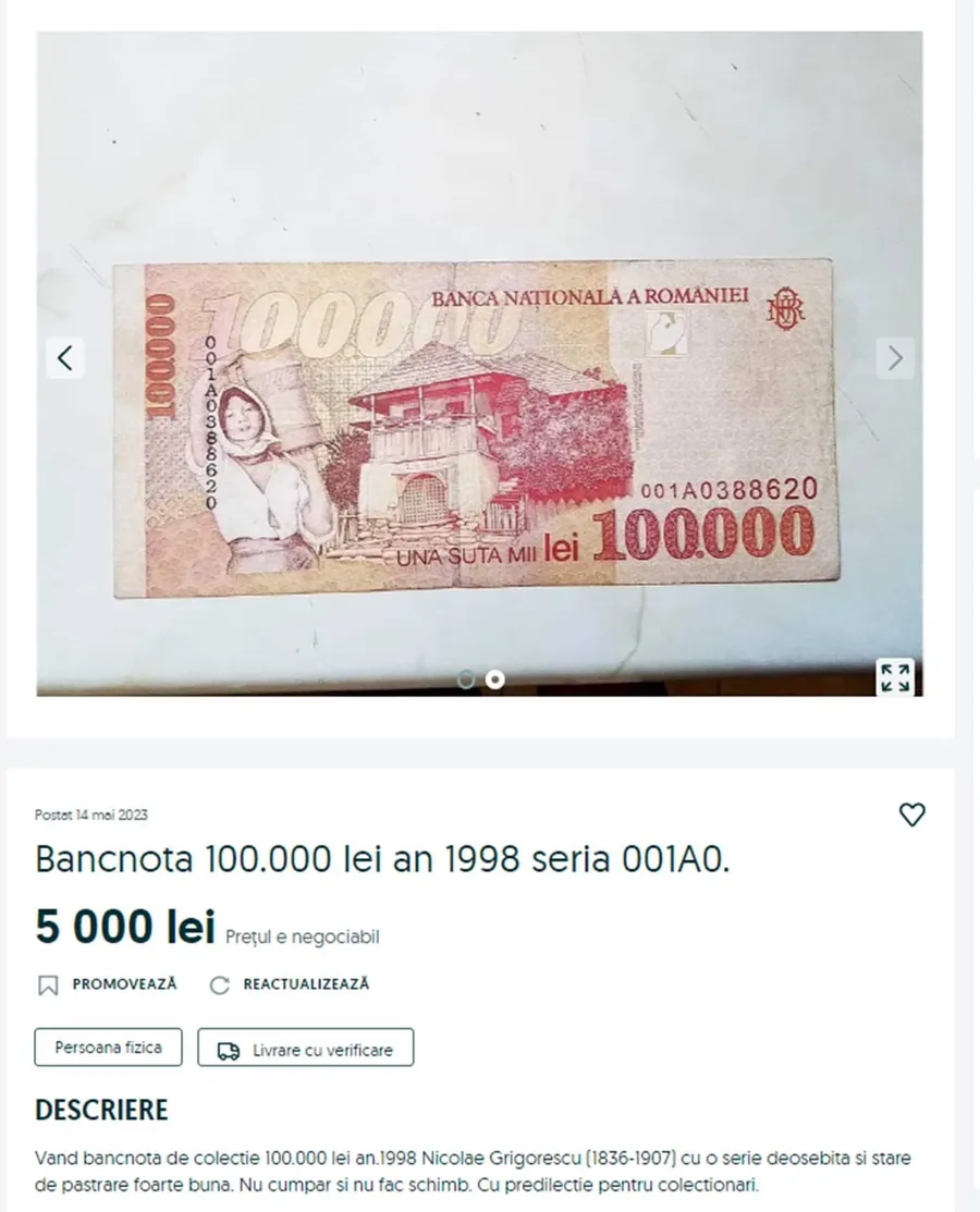 „Vând bancnotă de colecție 100.000 lei an.1998 Nicolae Grigorescu (1836-1907), cu o serie deosebită (001Ao) și stare de păstrare foarte bună. Nu cumpăr și nu fac schimb. Cu predilecție pentru colecționari”, se arată în anunțul respectiv.