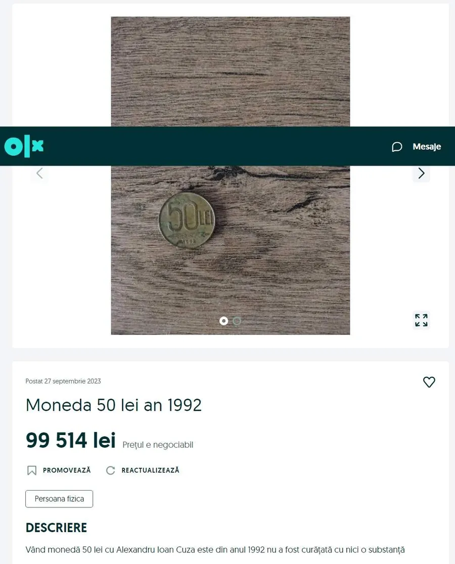 „Vând monedă 50 de lei cu Alexandru Ioan Cuza! Este din anul 1992, nu a fost curățată cu nici o substanță”, se arată într-un anunț pe OLX.