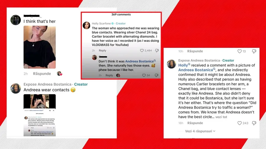 Holly a răspuns că descrierea pare să se potrivească, iar detaliile care au convins-o cel mai mult au fost: brățara Chanel, geanta Cartier, lentilele de contact albastre exact accesoriile pe care Andreea Bostănică le afișase recent pe TikTok.