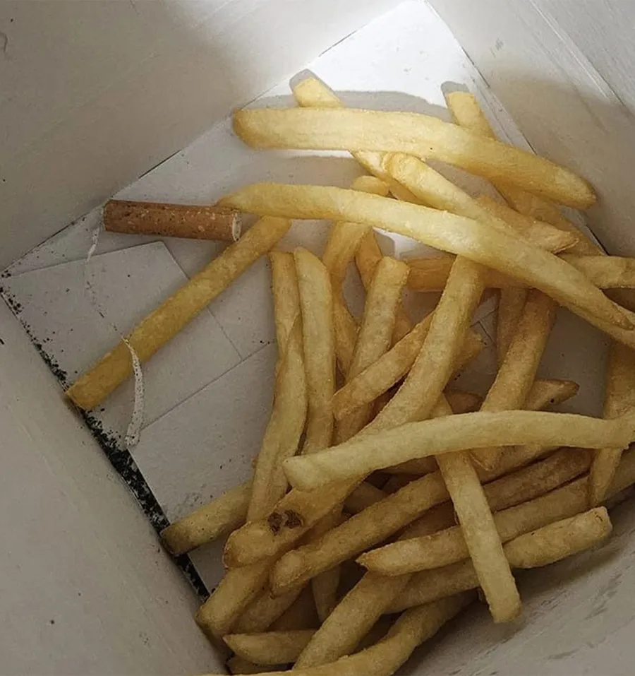 „Uitați de jucărie. Acum vine cu capăt de țigară și scrum pentru un plus de gust. Am sunat pentru a face o plângere, dar mi s-a vorbit nepoliticos, apoi mi-a închis telefonul!!!”, a scris mama supărată într-o postare pe Facebook, împreună cu o fotografie a țigării printre cartofii prăjiți.