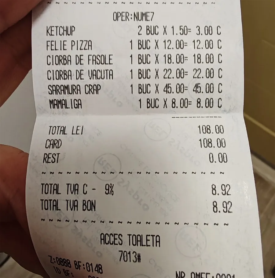 Bucata de pizza a costat-o 12 lei, iar ketchup-ul 3 lei, căci a venit separat. N-au venit la „pachet”, așa cum se obișnuiește atunci când cumperi o singură felie de pizza, ci tânăra a fost nevoită să plătească și cele 2 plicuri de ketchup. Cel mai mare preț de pe nota de plată l-a avut porția de saramură de crap: 45 de lei!