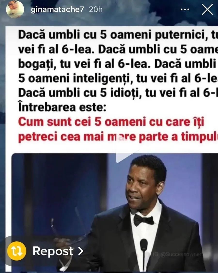 Întrebarea este: Cum sunt cei cinci oameni cu care îți petreci cea mai mare parte a timpului”, se arată în postarea Ginei Matache.