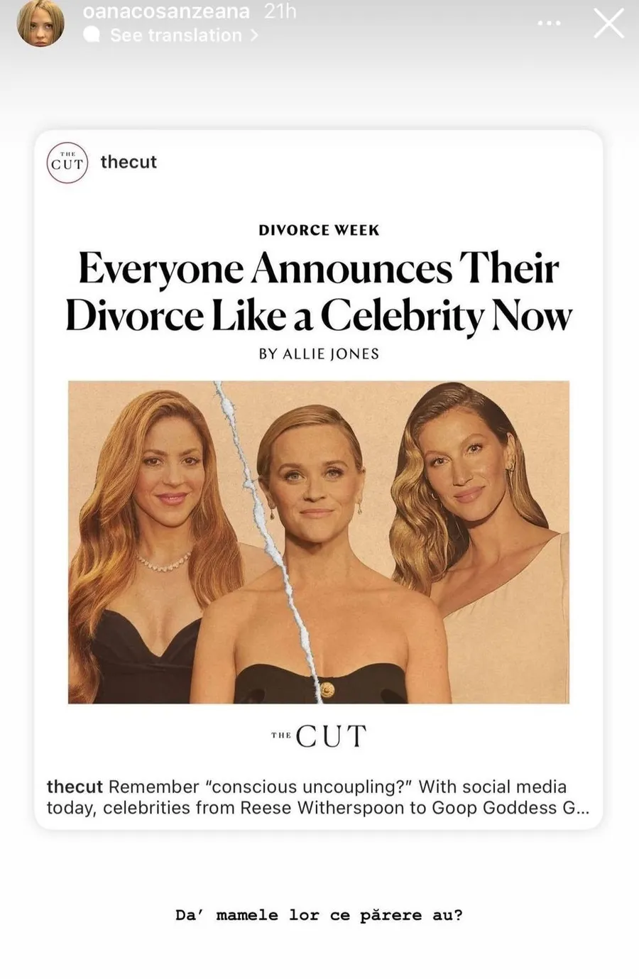 „Da’ mamele lor ce părere au?”, a fost comentariul Oanei Matache, care a însoțit articolul legat de divorțul celebrităților.