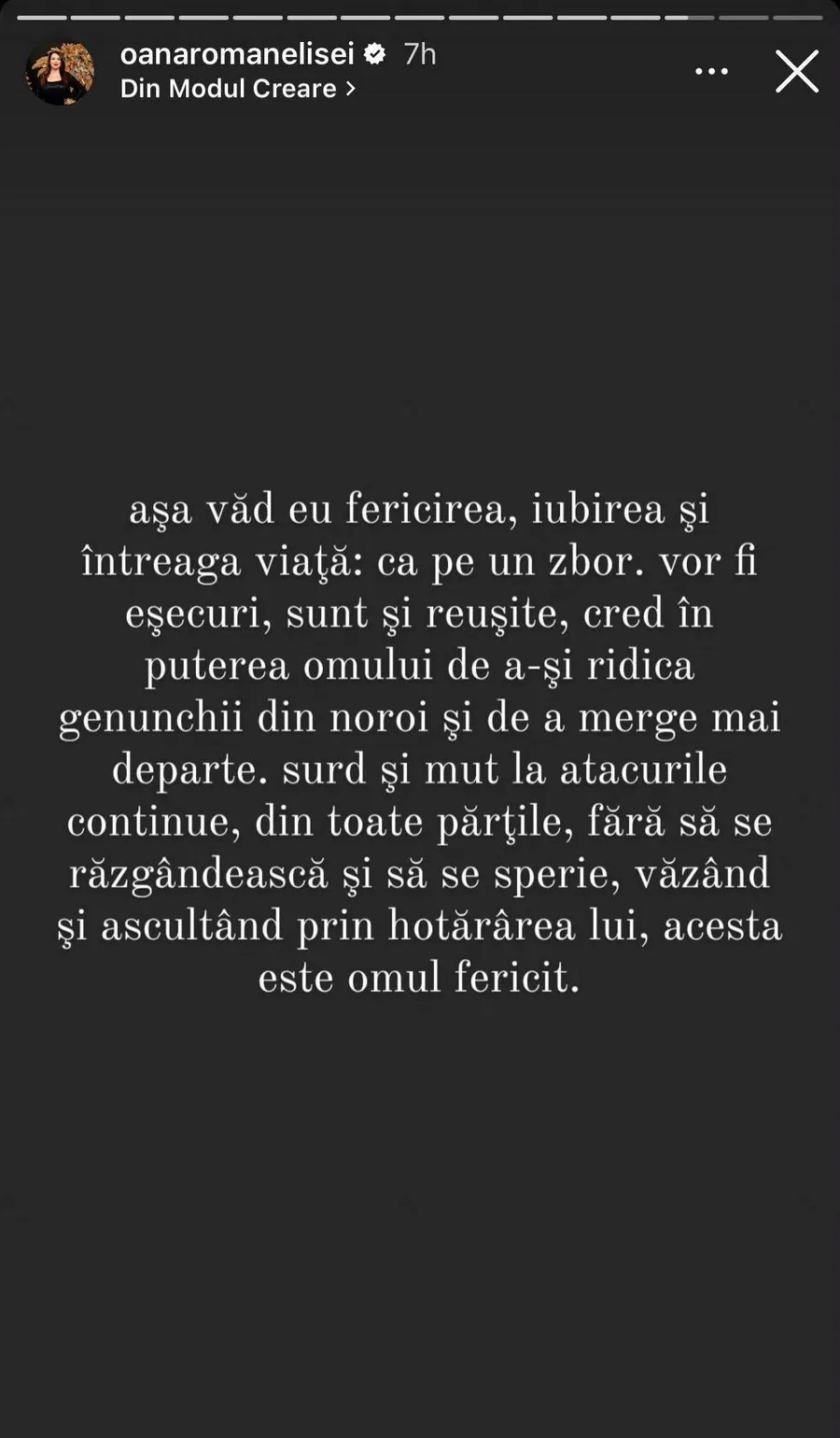 „Așa văd eu fericirea, iubirea și întreaga viață: ca pe un zbor. Vor fi eșecuri, sunt și reușite, cred în puterea omului de a-și ridica genunchii din noroi și de a merge mai departe. Surd și mut la atacurile continue, din toate părțile, fără să se răzgândească și să se sperie, văzând și ascultând prin hotărârea lui. Acesta este omul fericit!”, a fost mesajul postat de vedetă pe pagina sa de Instagram, la secțiunea InstaStory.