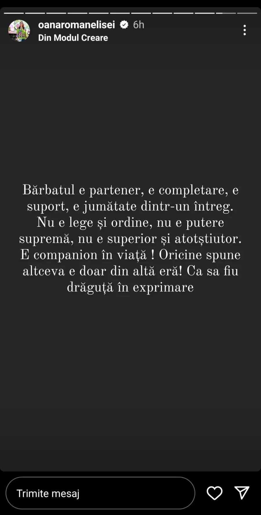 „Bărbatul este partener, e completare, e suport, e jumătate dintr-un întreg. Nu e lege și ordine, nu e superior și atotștiutor. E companion în viață! Oricine spune altceva, e doar din altă eră! Ca să fiu drăguță în exprimare”