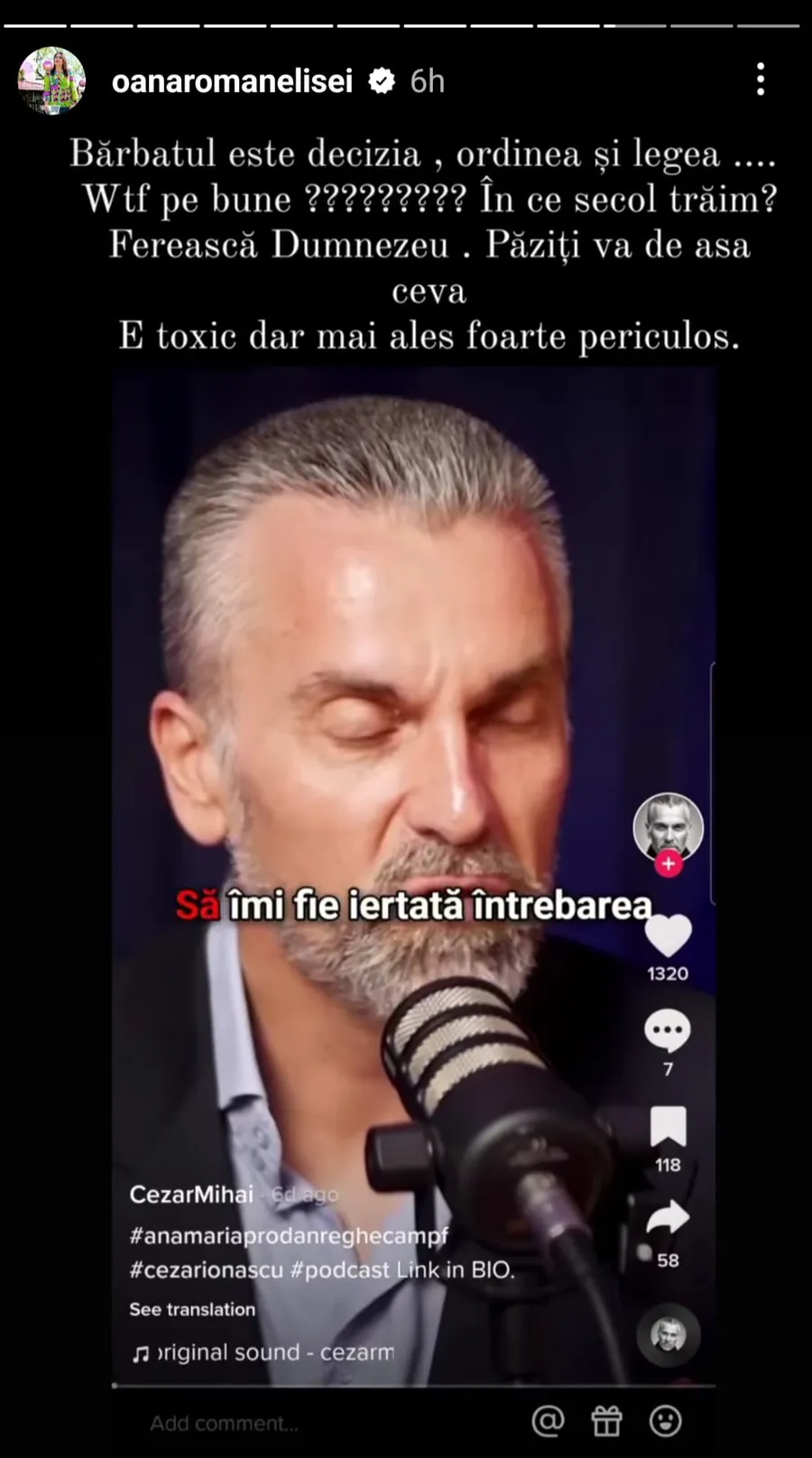 „Bărbatul este decizia, ordinea și legea… Wtf pe bune????? În ce secol trăim? Ferească Dumnezeu. Păziți-vă de așa ceva. E toxic, dar mai ales foarte periculos”, a spus Oana Roman despre Cezar Ionașcu pe Instagram