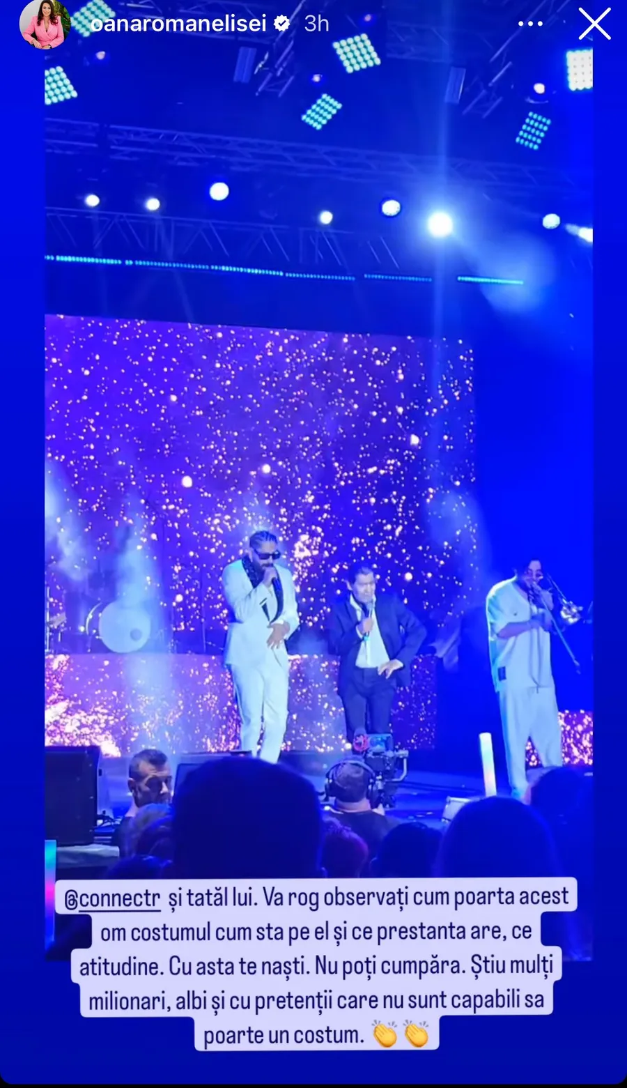 „Connect-R și tatăl lui. Vă rog să observați cum poartă acest om constumul, cum stă pe el și ce prestanță are, ce atitudine. Cu asta te naști. Nu poți cumpăra. Știu mulți milionari, albi și cu pretenții, care nu sunt capabili să poarte un costum”, a notat Oana Roman pe rețelele de socializare.