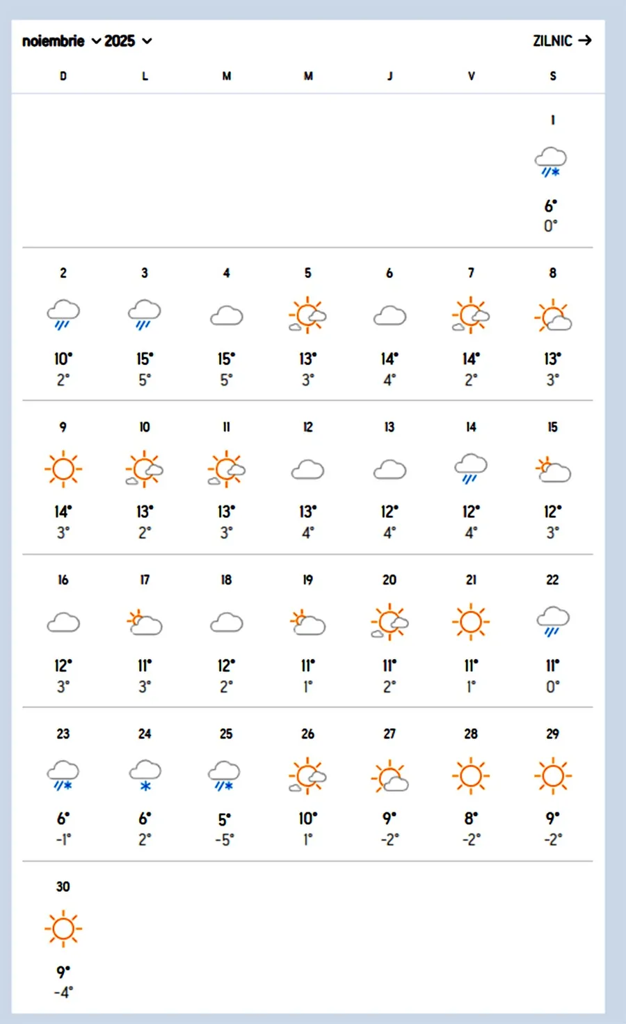 În ultima săptămână din noiembrie, vremea se va răci, iar maximele nu vor depăși 9 grade Celsius. În unele zile vor fi chiar și 6 grade pe timp de zi. Minimele vor coborî până la -1 grade Celsius, iar în unele zone chiar și până la -5 grade Celsius.