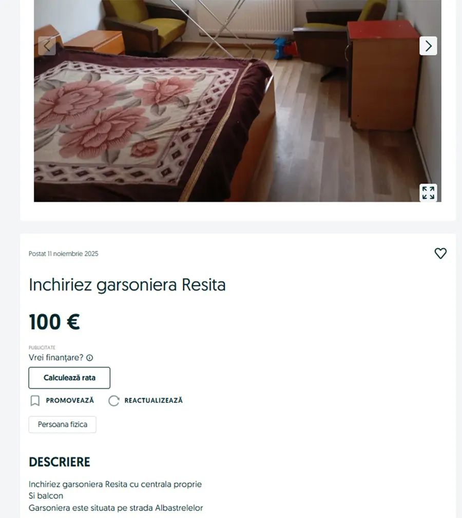 Pe OLX, cea mai ieftină garsonieră listată se găsește în Reșița, pe strada Albăstrelelor. Garsoniera care costă numai 100 de euro pe lună este dotată cu centrală proprie. Pe lângă camera principală are și o baie și bucătărie. Este drept că dotările sunt unele minimale, însă prețul este unul atractiv.