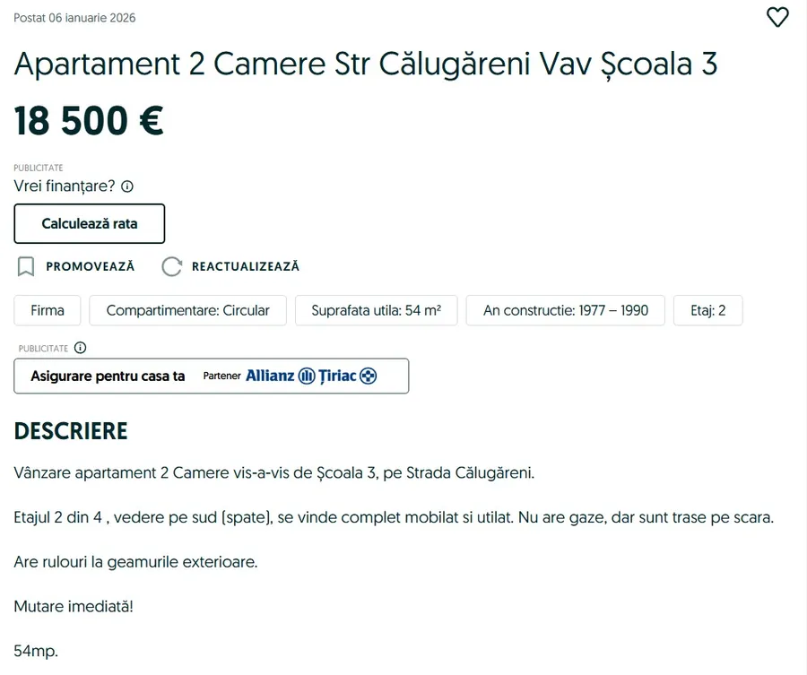 Spre exemplu, un anunț de pe una dintre cele mai mari platforme de vânzare-cumpărare a atras atenția celor care sunt în căutarea unei locuințe. Apartamentul de 18.500 de euro se află în Zimnicea, județul Teleorman, pe strada Călugăreni, vizavi de Școala nr. 3. Are o suprafață de 54 mp, este situat la etajul 2 al unui bloc cu 4 etaje – construcție pe structură din beton (anul 1979).