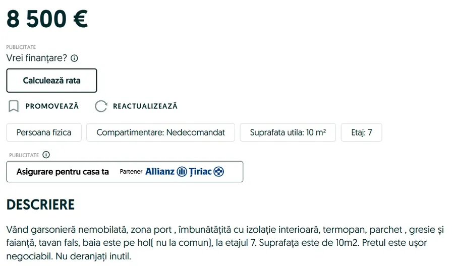 “Vând garsonieră nemobilată, zona port , îmbunătățită cu izolație interioară, termopan, parchet , gresie și faianță, tavan fals, baia este pe hol (nu la comun), la etajul 7. Suprafața este de 10m2. Pretul este ușor negociabil. Nu deranjați inutil.”, se arată în descrierea anunţului.