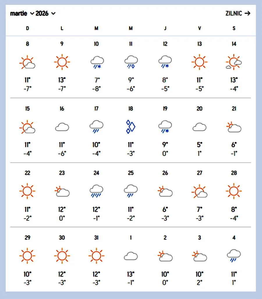 Se întoace iarnă în România! Potrivit estimărilor publicate de meteorologii Accuweather, ninsorile nu vor ocoli Miercurea Ciuc nici în luna martie. Primăvara se lasă așteptată, iar episoadele de iarnă nu au dispărut complet. Temperaturile nocturne vor coborî până la -8 grade Celsius. Abia după jumătatea lunii vremea va începe să se stabilizeze.