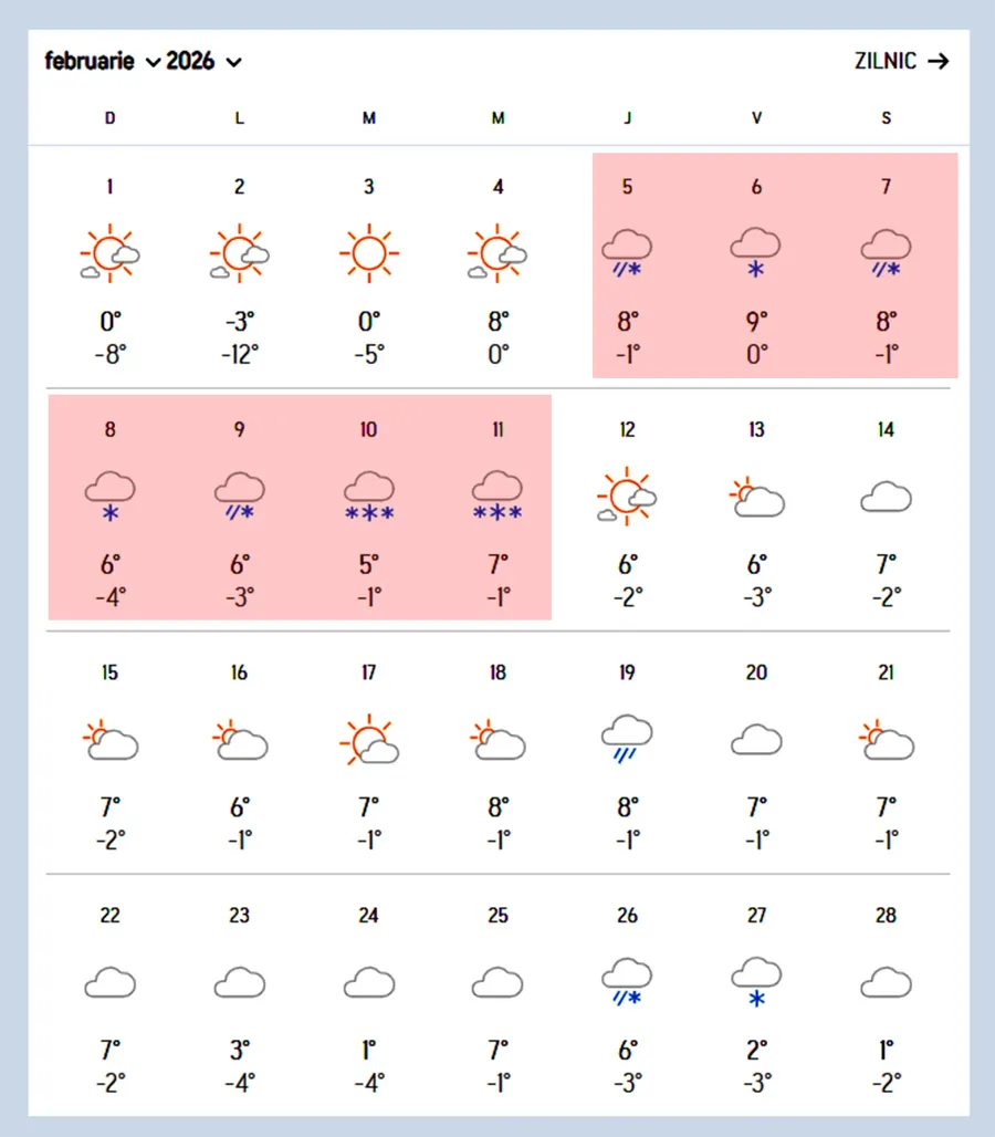 Conform datelor Accuweather prezentate în calendarul meteo, intervalul 5–11 februarie este marcat de precipitații continue, în special sub formă de ninsoare și lapoviță.