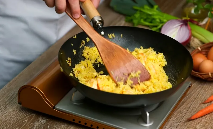 Puțină istorie înainte să aprindem focul. Orezul prăjit își are rădăcinile în perioada Dinastiei Sui (589–618 d.Hr.), când gospodinele chineze căutau metode inteligente de a folosi orezul rămas de peste zi. Așa s-a născut tehnica de a sota rapid orezul cu legume, ouă și proteine disponibile. În sudul Chinei, mai ales în stilul cantonez, varianta cu fructe de mare, în special creveți, a devenit extrem de apreciată datorită gustului său delicat.