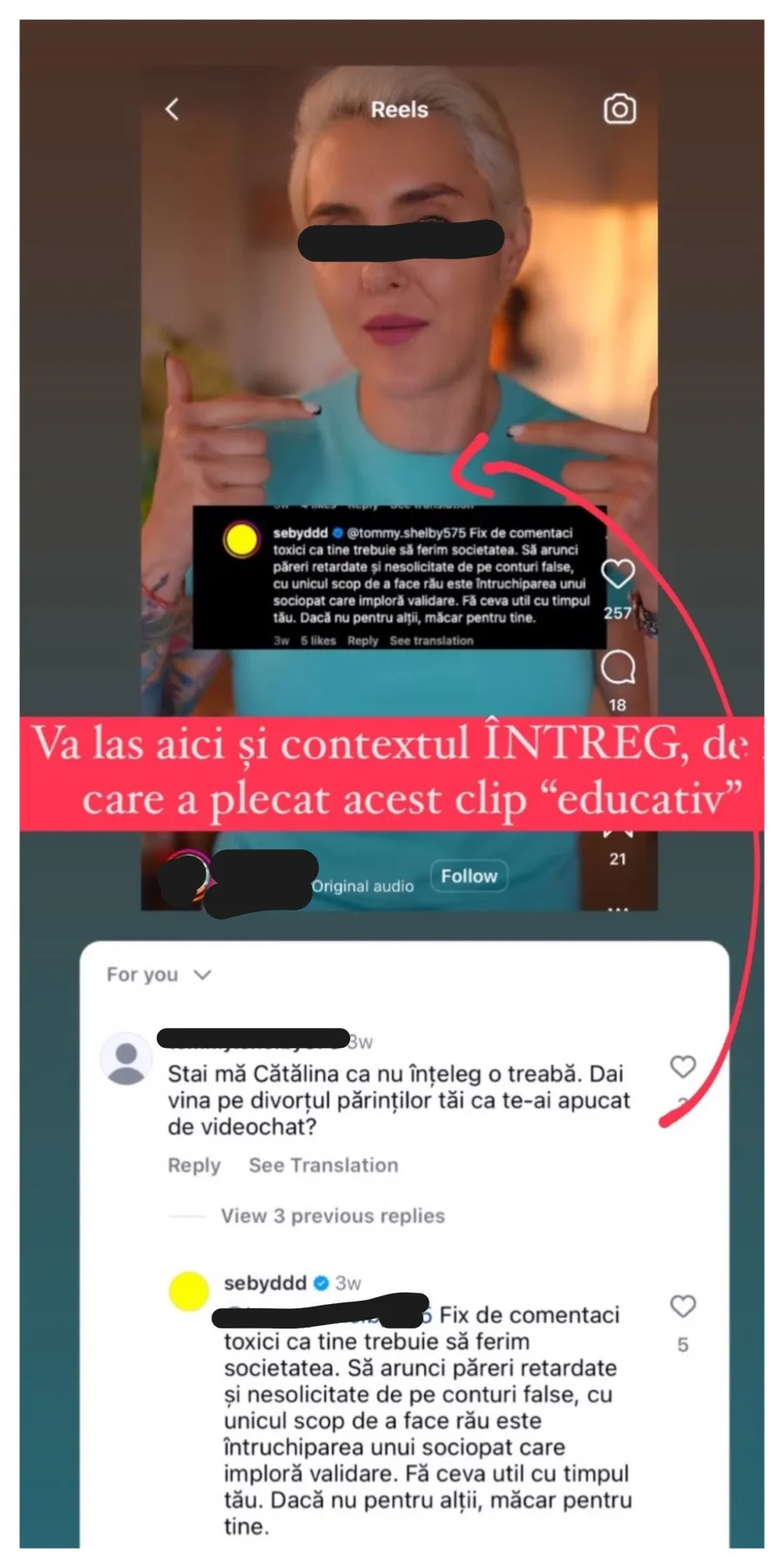 „Fix de comentarii toxici ca tine trebuie să ferim societatea. Să arunci păreri retardate şi nesolicitate de pe conturi false, cu unicul scop de a face rău este întruchiparea unui sociopat care imploră validare. Fă ceva util cu timpul tău. Dacă nu pentru alții, măcar pentru tine.”, a fost comentariul lisat de Sebastian Dobrincu.