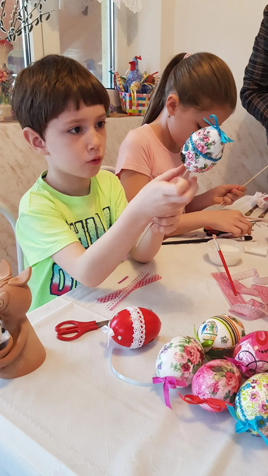 „Am pus lipici pe ou, apoi am tăiat câțiva trandafiri, i-am lipit și am dat cu încă un strat de lac peste”, spune micuța Teodora. La rândul, ei, Andreea vine cu completări: „Prima dată vopsim oul, apoi aplicăm puțin lipici și punem motivele”.