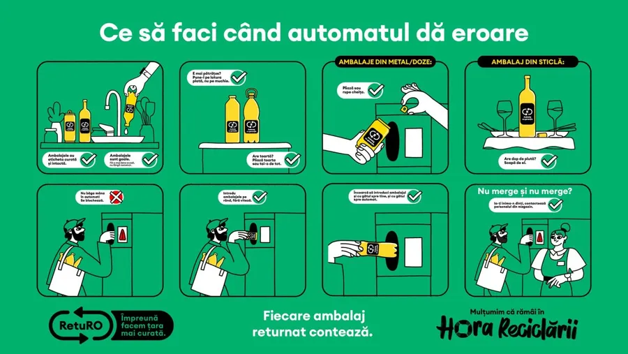 Iată care sunt pașii recomandați de RetuRO pentru a returna ambalaje cu garanție la RVM-uri, corect, rapid și fără bătăi de cap.