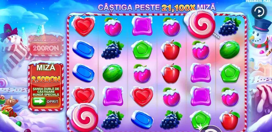 Fructele și bomboanele de pe grilă au zăpadă pe ele, chiar și acadeaua care îți aduce extra rotiri dacă apare în minim patru exemplare pe ecran. În jocul special nu mai apar bombe cu multiplicatori, ci globuri de brad aurii, ce înmulțesc câștigul cu până la 100x. Pictogramele plătesc oriunde s-ar afla pe grilă, chiar dacă nu sunt pe poziții adiacente.