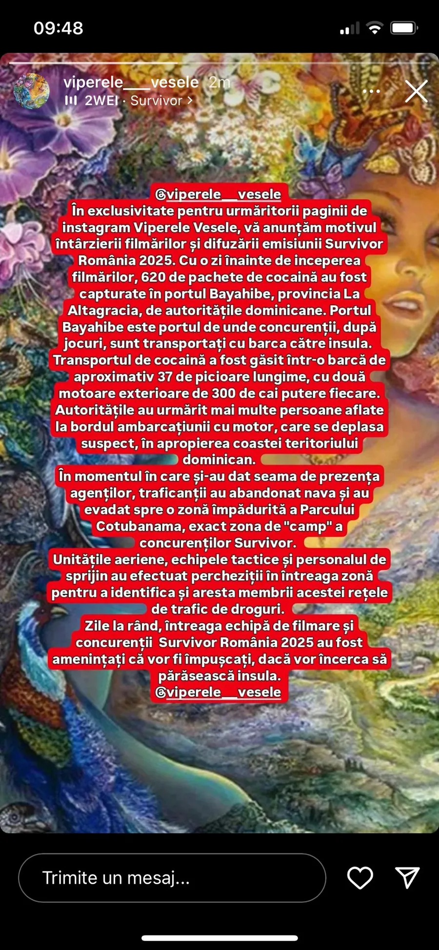 „În exclusivitate pentru urmăritorii paginii de Instagram Viperele Vesele, vă anunțăm motivul întârzierii filmărilor și difuzării emisiunii Survivor România 2025. Cu o zi înainte de începerea filmărilor, 620 de pachete de cocaină au fost capturate în portul Bayahibe, provincia La Altagracia, de autoritățile dominicane.