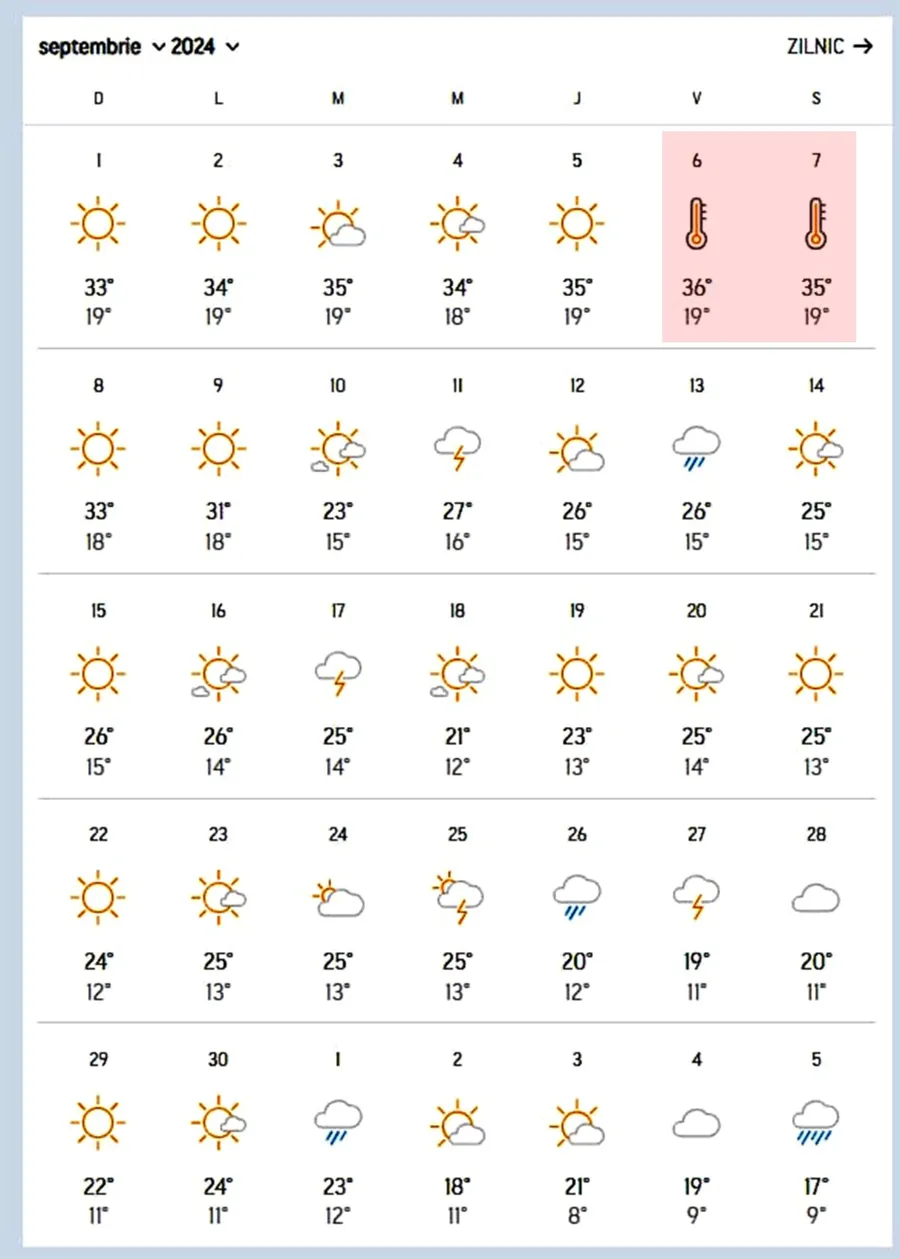 În București, în perioada 2-8 septembrie, temperaturile maxime se vor situa în jurul valorilor de 34-35 de grade. Cea minimă se va situa între 18 și 19 grade Celsius. Potrivit meteorologilor Accuweather, cele mai călduroase zile din această toamnă vor aduce clima sahariană și temperaturi caniculare. Este vorba despre ziua de vineri (6 septembrie) și sâmbătă (7 septembrie). Temperatura maximă atinge 36 de grade.