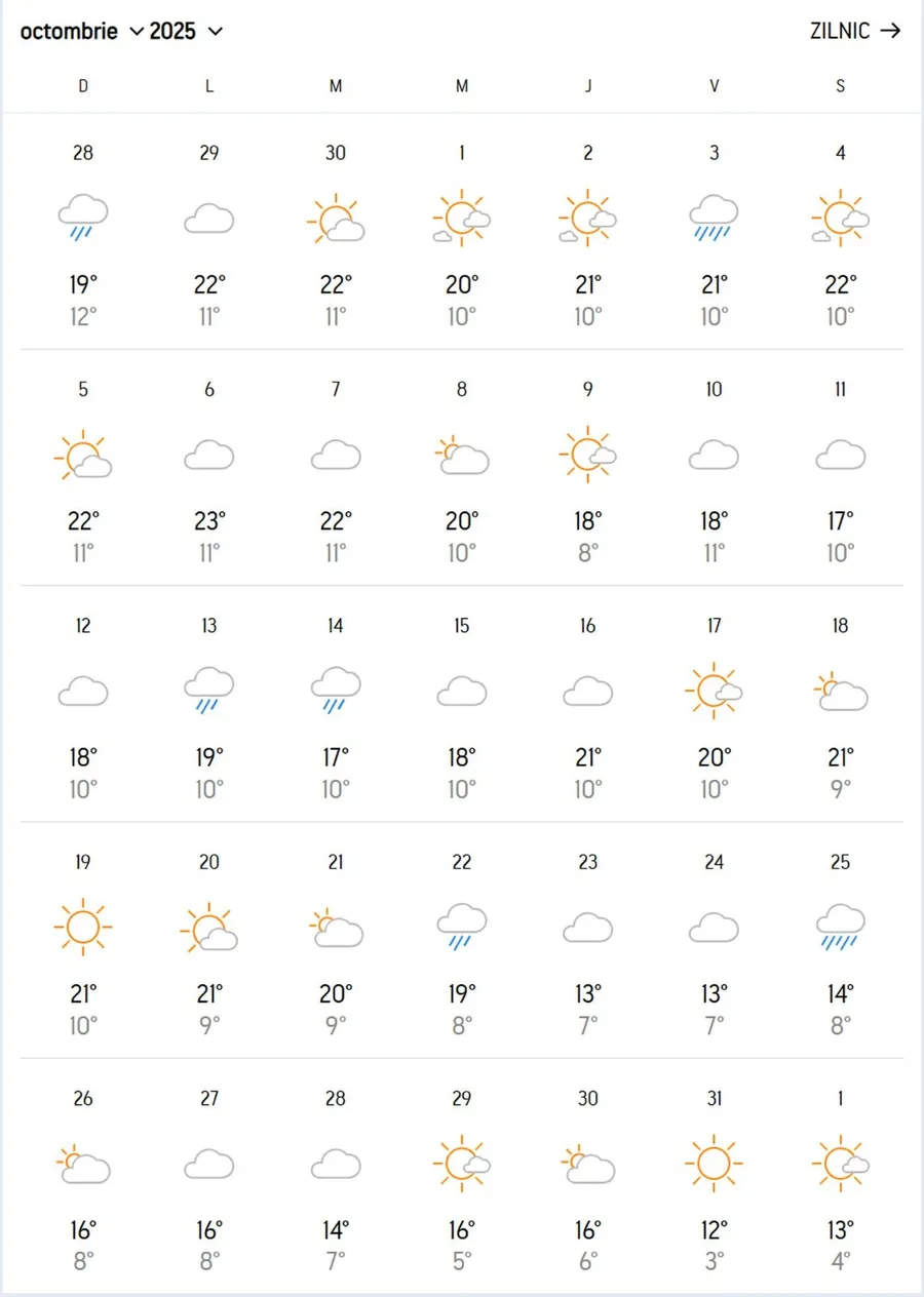 În Capitală, schimbarea se va resimți spre finalul lunii, când probabilitatea de ploaie crește semnificativ. Temperaturile vor coborî sub 20 de grade, iar zilele cu cer senin vor fi tot mai rare. Primle zile din luna octombrie aduc și primele ploi.