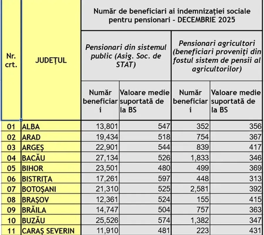 Astfel, chiar și într-un context de stagnare a pensiilor și presiune bugetară, statul român continuă să intervină pentru a asigura un trai minim pensionarilor cei mai vulnerabili. Ajutoarele lunare variază în funcție de județ, reflectând diferențele regionale în structura pensiilor și numărul beneficiarilor. Cele mai mari completări lunare se înregistrează în Maramureș (628 lei) și Hunedoara (602 lei), în timp ce cele mai mici se înregistrează în Giurgiu (484 lei).