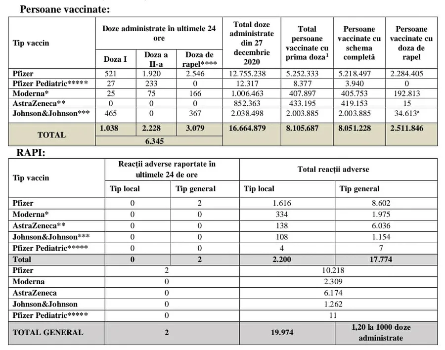 Potrivit raportului, în 24 de ore, s-au administrat 6.345 doze de vaccin. De la ultima raportare care a avut loc luni, s-au raportat două reacții adverse.