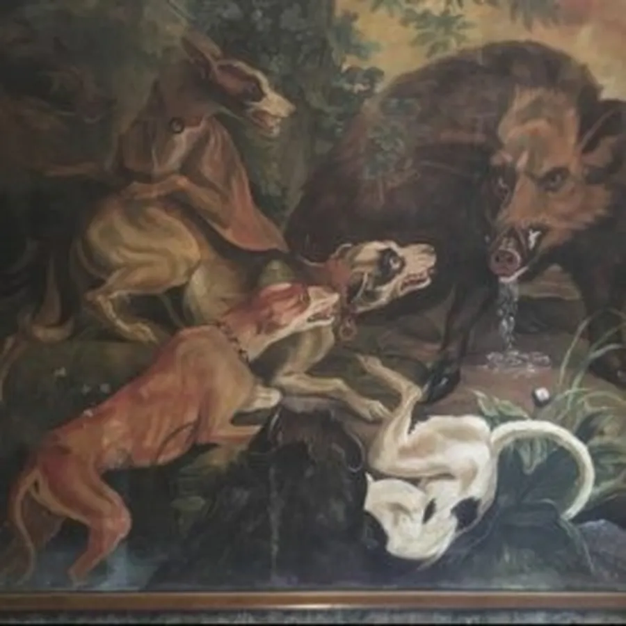 Tabloul ”Vânătoare de mistreți”, pictat de Mihai Dumitru Martalogu, a fost expus la cabana de la Seaca