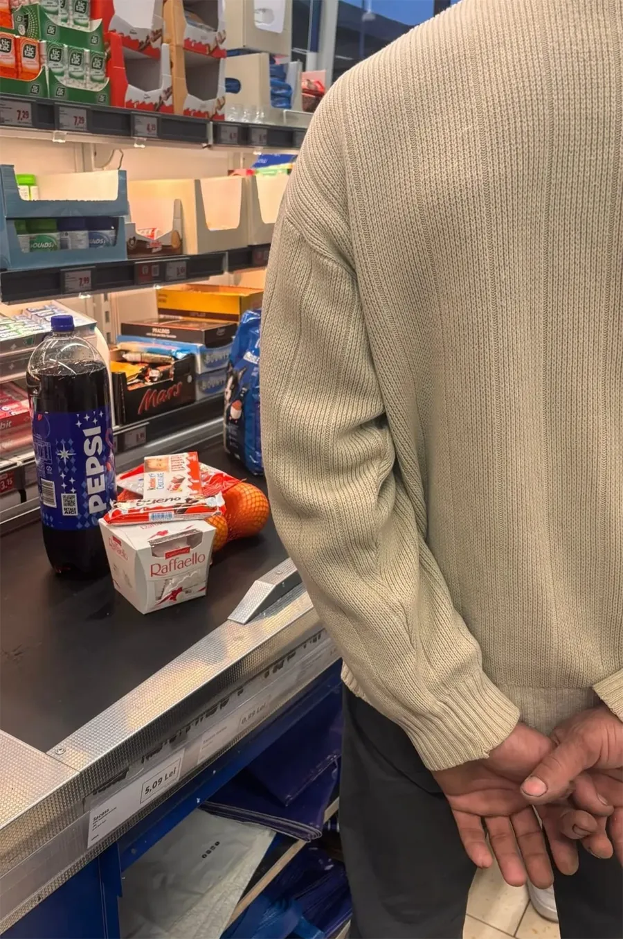 „Adevăratul Moș Nicolae nu poartă barbă și nu vine cu sania. El stă la coadă, cu un pulover simplu și mâinile obosite ascunse la spate, așteptând în liniște. Pe bandă nu sunt doar dulciuri, mandarine și o sticlă de cola — sunt mici bucăți de fericire pregătite cu grijă pentru cineva drag. Avea în portofel doar 200 de lei. I-a scos pe toți ca să plătească, probabil fără să știe cât va costa în final… dar faptul că era gata să îi dea pe toți spune totul.
