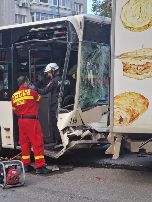 Accident grav între un autobuz STB și o autoutilitară, în București. Patru persoane au fost rănite și duse la spital
