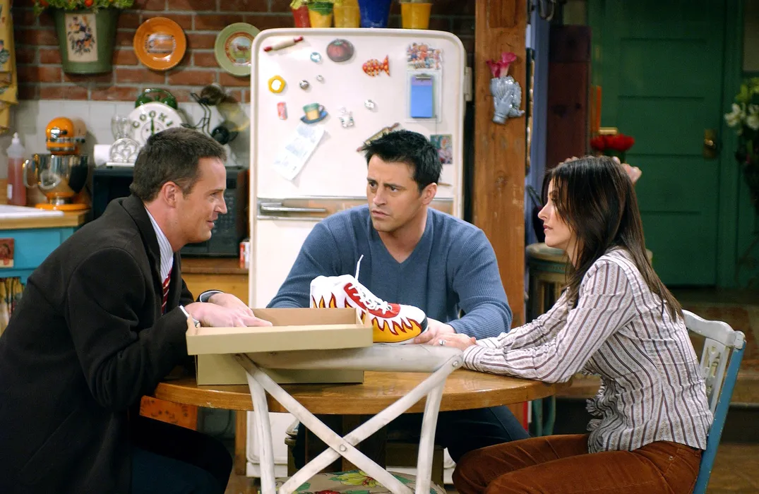 Matthew Perry, Matt Le Blanc și Courteney Cox, în sezonul 9 din “Friends”. Foto: Profimedia