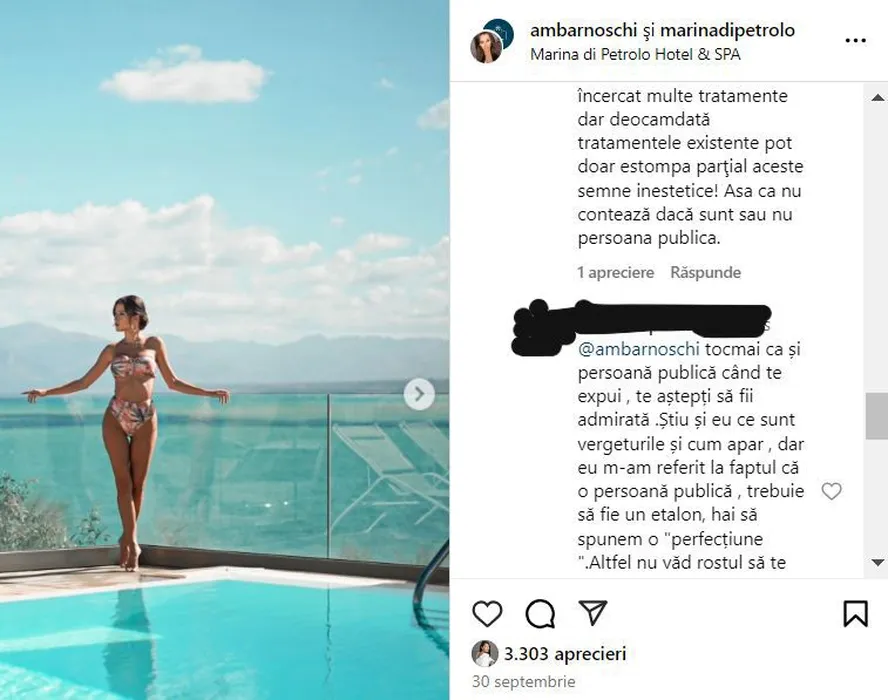 Ana Maria Barnoschi, taxată aspru pentru apariția la piscină. Un fan, nemulțumit de câte vergeturi are