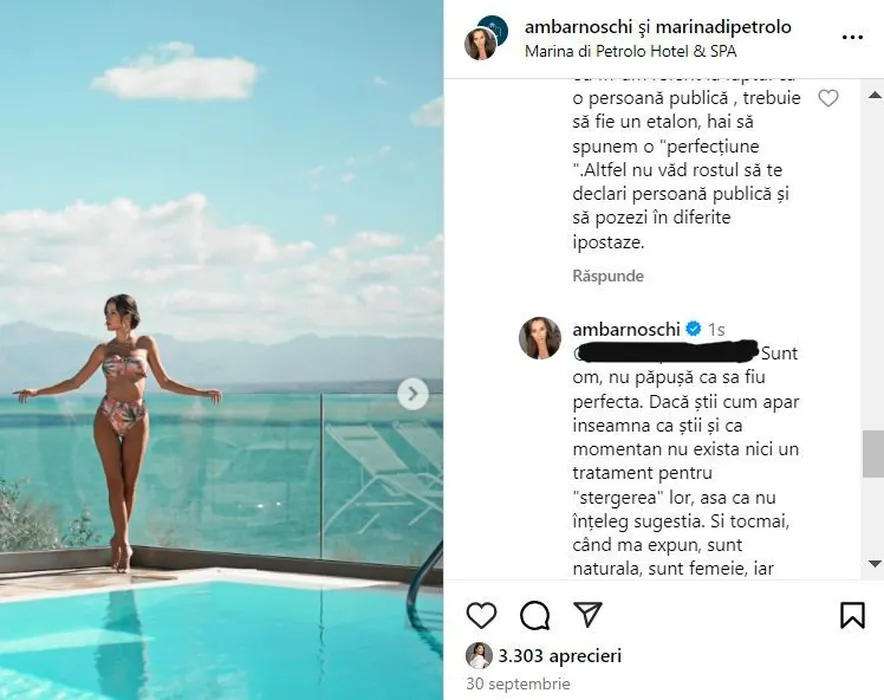 Ana Maria Barnoschi, taxată aspru pentru apariția la piscină. Un fan, nemulțumit de câte vergeturi are