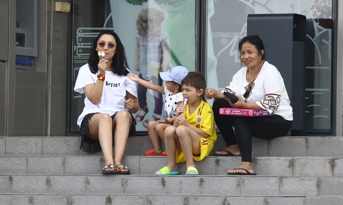 Andra a savurat o înghețată alături de copii pe scările unui supermarket