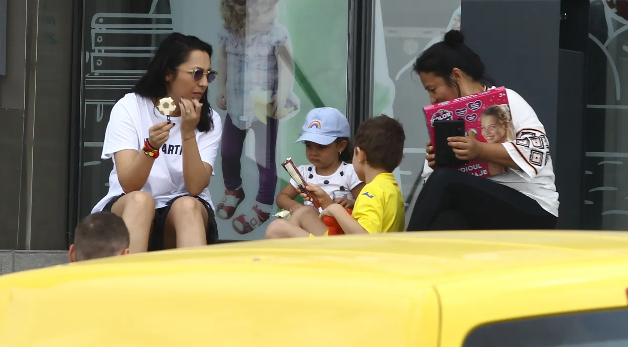 Andra a savurat o înghețată alături de copii pe scările unui supermarket