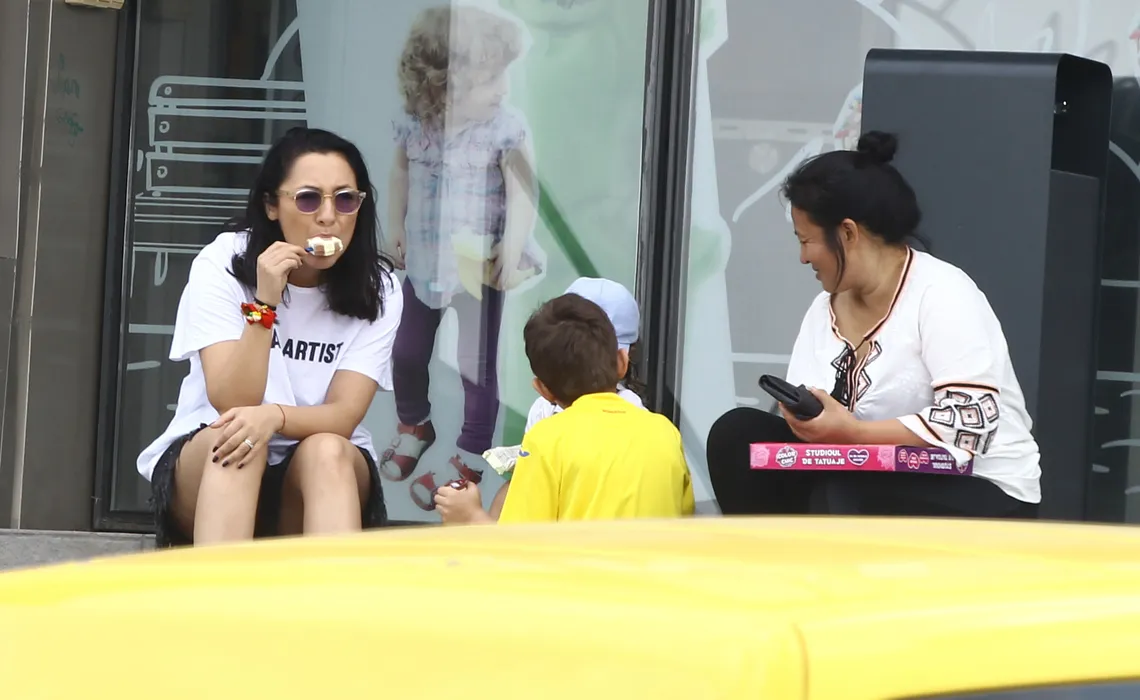 Andra a savurat o înghețată alături de copii pe scările unui supermarket