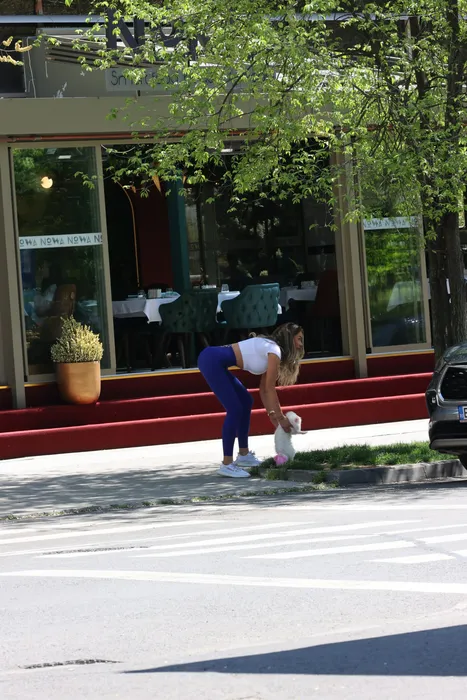 Bianca Drăgușanu a oferit imaginea incendiară chiar în fața restaurantului, grație cățelului care fugise de sub supravegherea ei (Foto: CANCAN.RO)