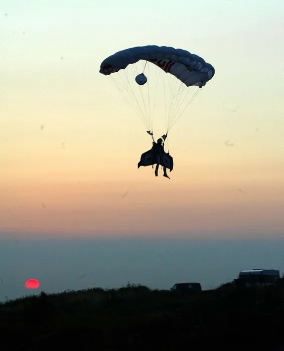 Felix Baumgarten aterizează la Calais după ce a zburat de la Dover. 30.07.2003. Foto: Profimedia