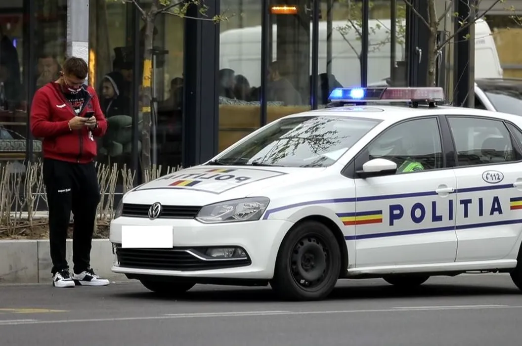 Cătălin Moroșanu își verifică telefonul lângă mașina de Poliție