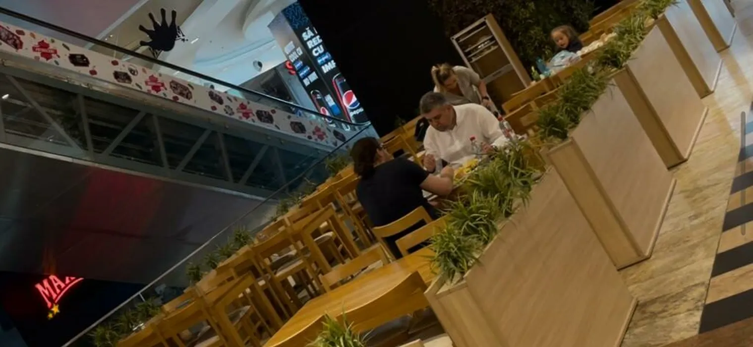 Marcel Ciolacu și fiul lui, Filip, la o masă de pește, în mall Băneasa (Foto: CANCAN.RO)