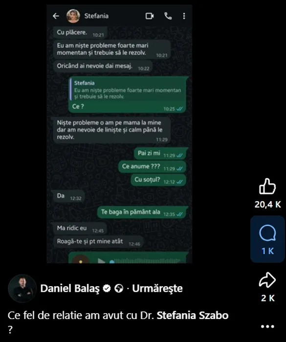 Ce mesaje i-a trimis medicul Ștefania Szabo lui Daniel Balaș. Fostul preot le-a făcut publice: „Nu sunt bine deloc”