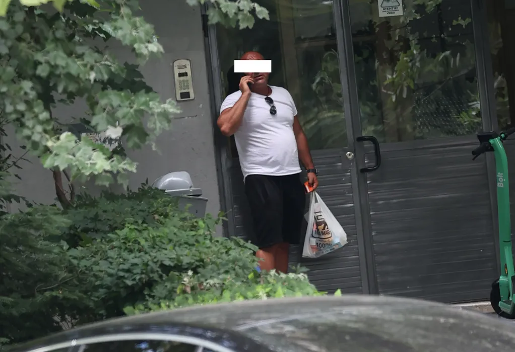 Soțul celebrei cântărețe vorbește la telefon, în fața blocului în care locuiește Ioana Popescu (Foto: CANCAN.RO)