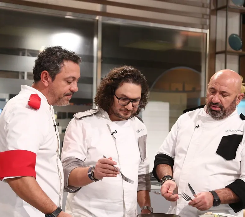 Sorin Bontea, Florin Dumitrescu și Cătălin Scărlătescu, la Chefi la Cuțite/ Foto: Captură Antena 1