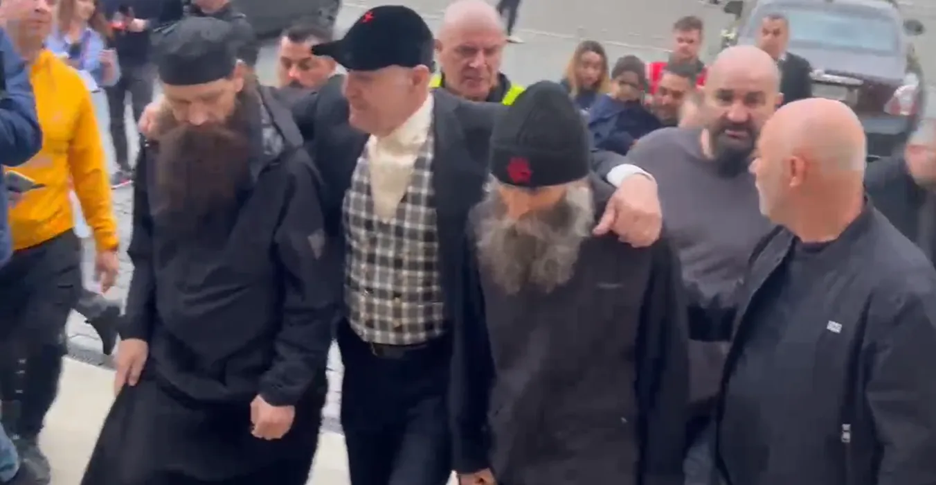 Gigi Becali și cei doi călugări alături de care a mers însoțit la Arena Națională / Foto: Captură Video