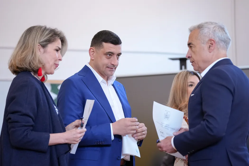 Cristela Georgescu (S) si Calin Georgescu (D), alaturi de George Simion, candidatul Aliantei pentru Unirea Romanilor ( AUR) la alegerile prezidentiale, isi exercita dreptul la vot, in cadrul celui de-al doilea tur al alegerilor prezidentiale, in Bucuresti, duminica, 18 mai 2025. ANDREEA ALEXANDRU/MEDIAFAX FOTO